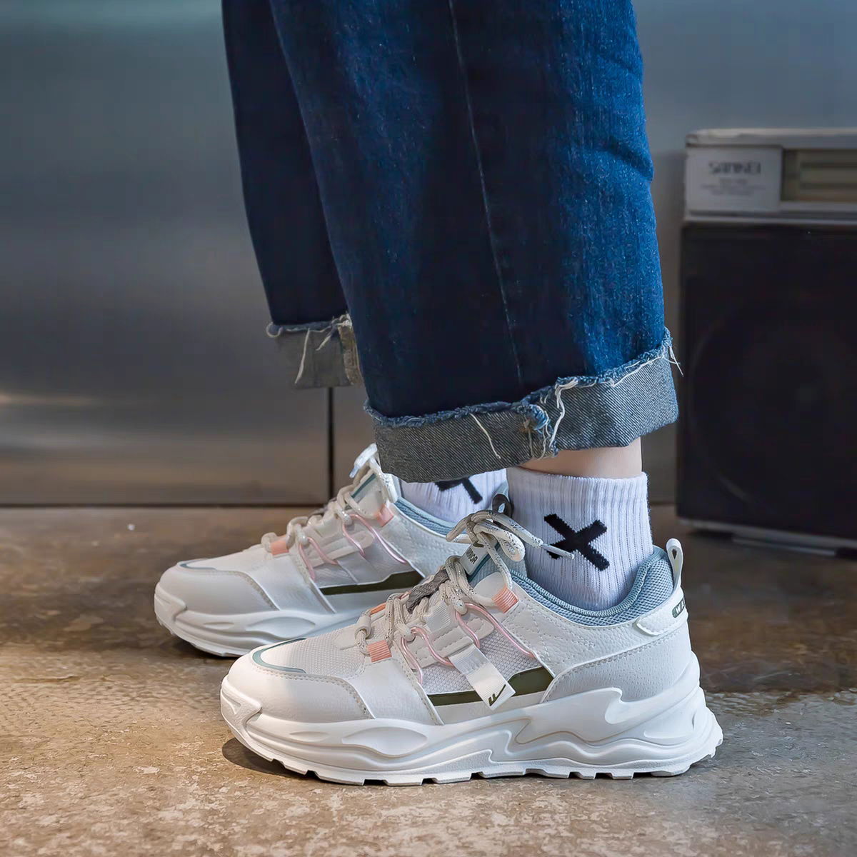 Zapatilla rosa con verde.