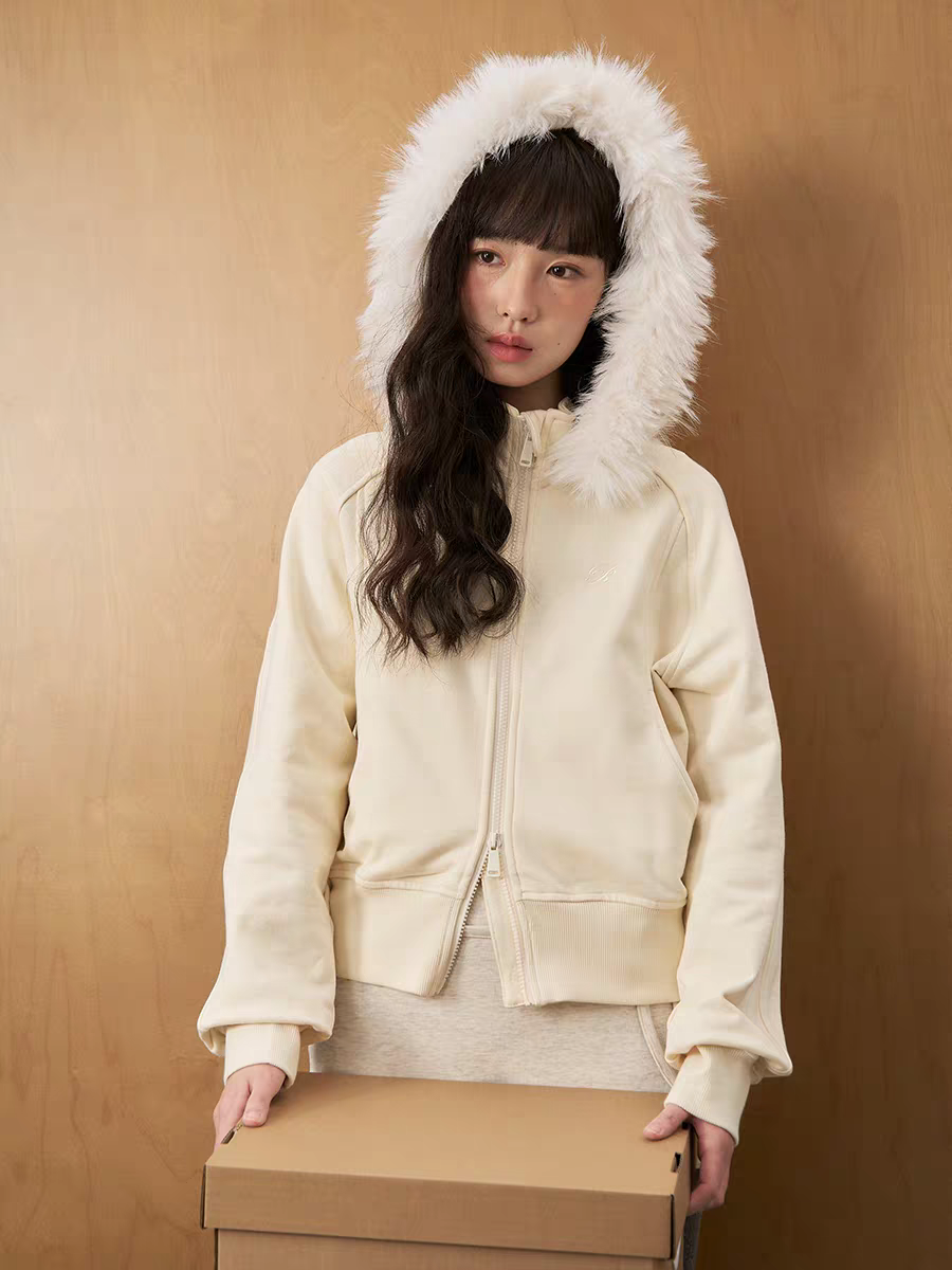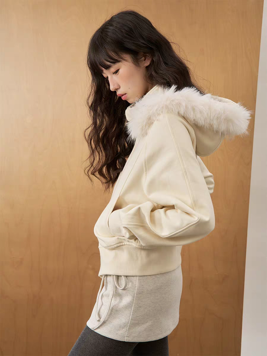 Campera Crema con Doble Cierre y Capucha de Piel Sintética