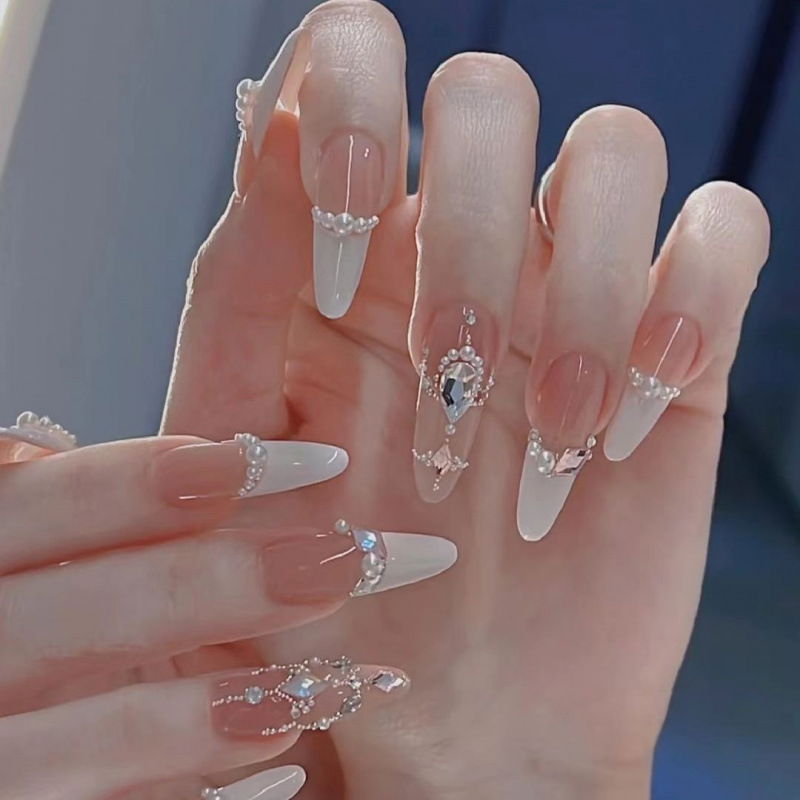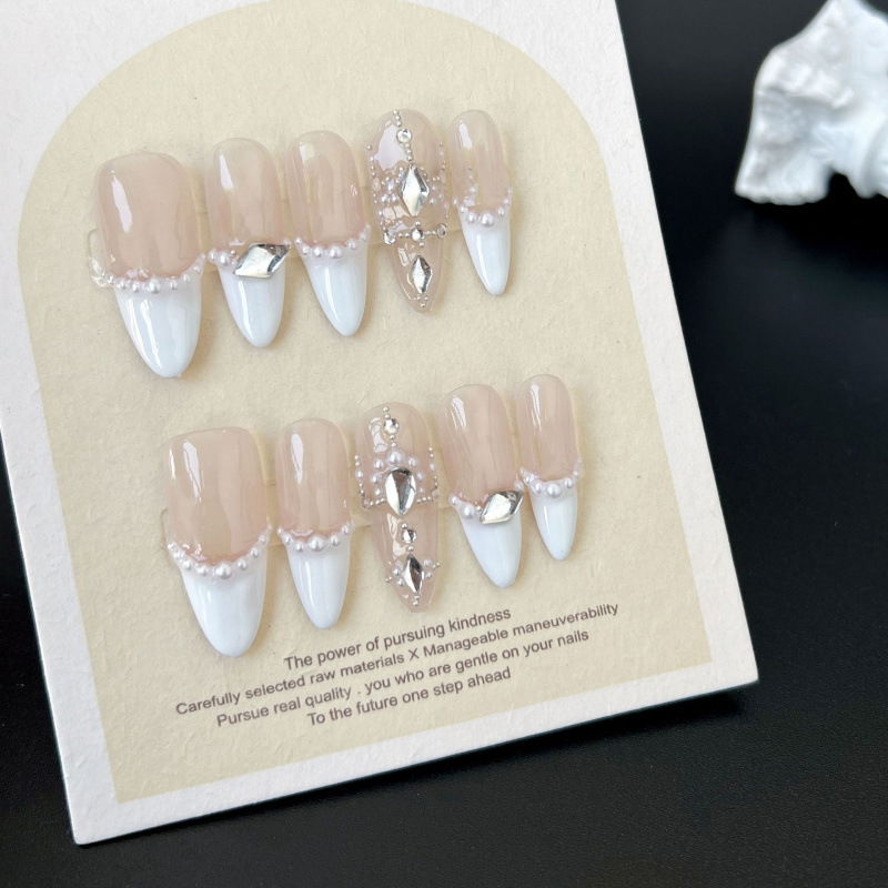 Uñas Press On Rosa y Blanco con Cristales