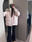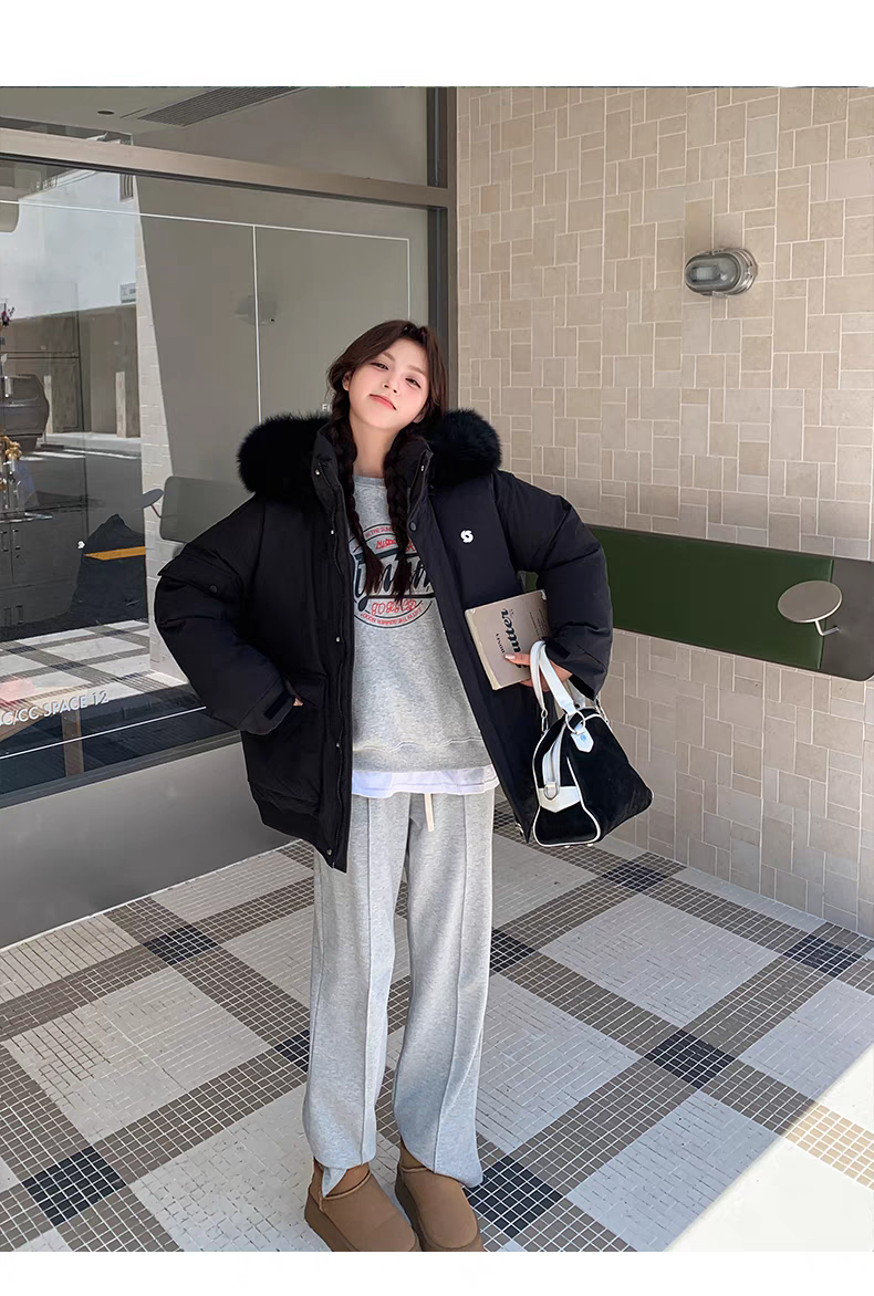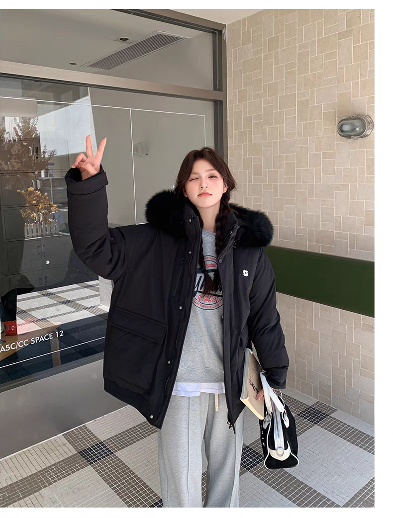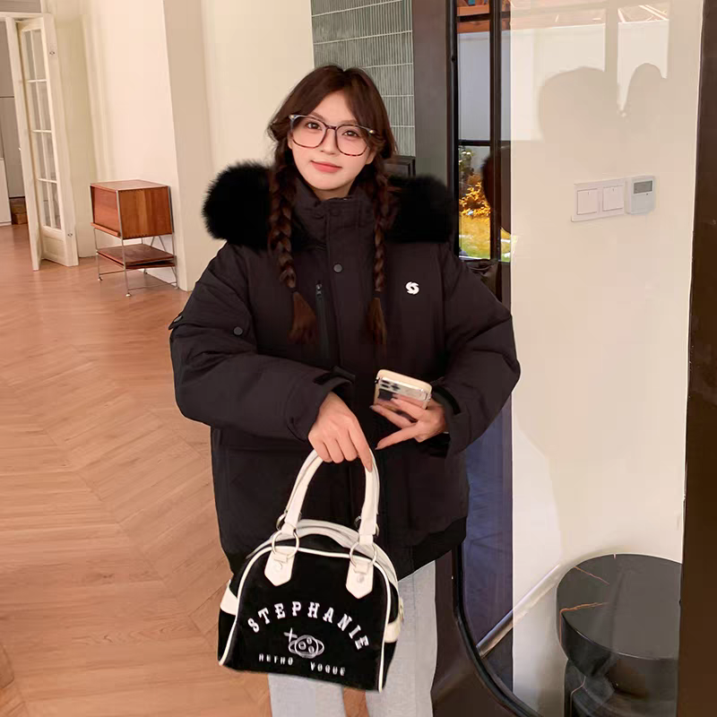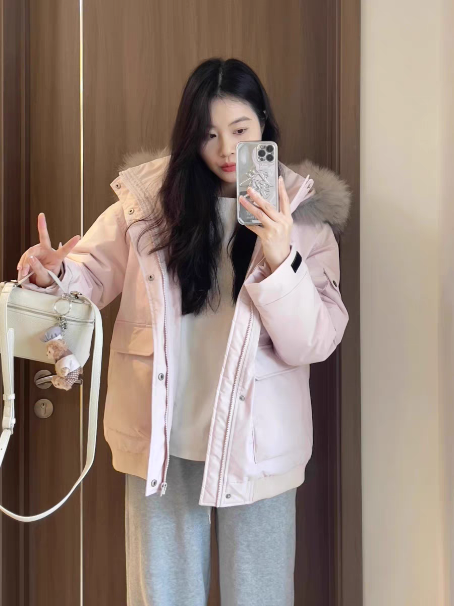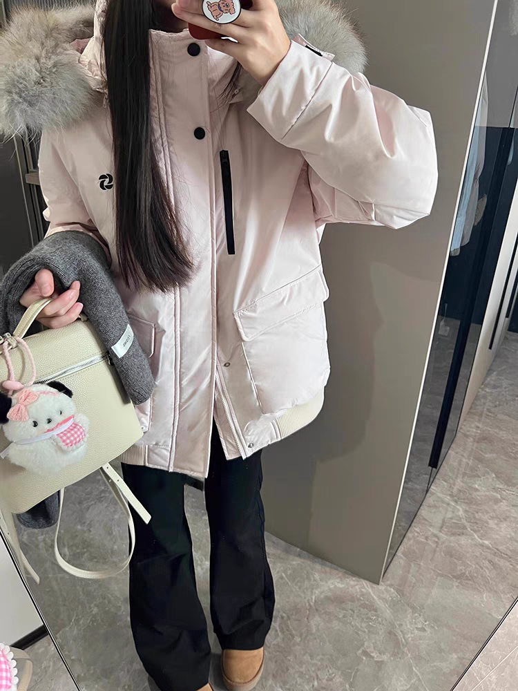 Campera tipo parka con capucha y piel sintética color rosa y negro