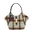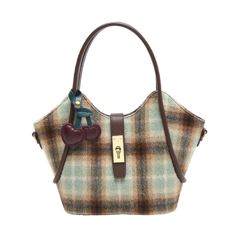 Cartera con diseño cuadrillé en tonos marrones y verde, con correa para usar colgada.