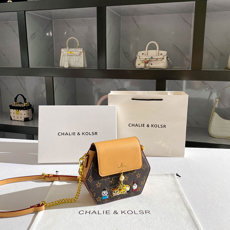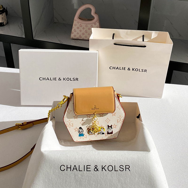Cartera de tamaño chico en forma hexagonal con bordado de gatitos, con correa ajustable.