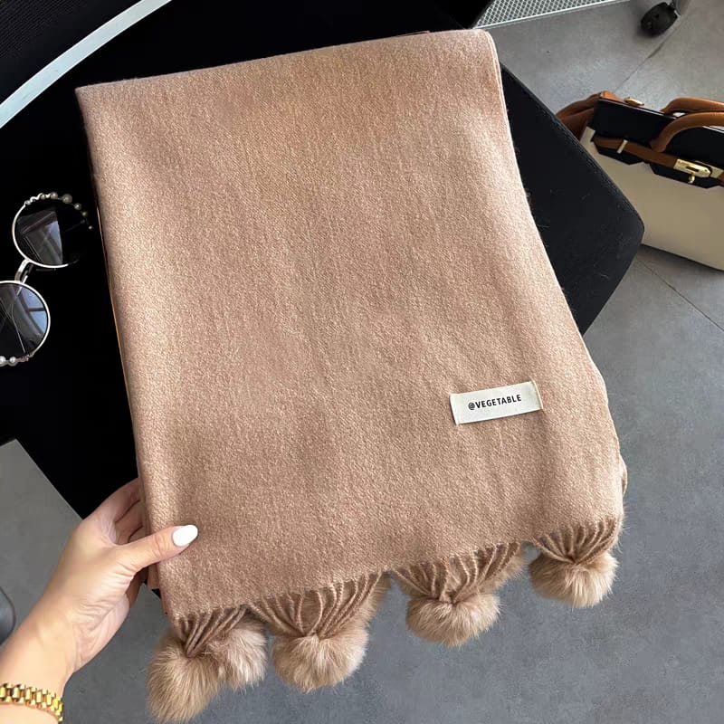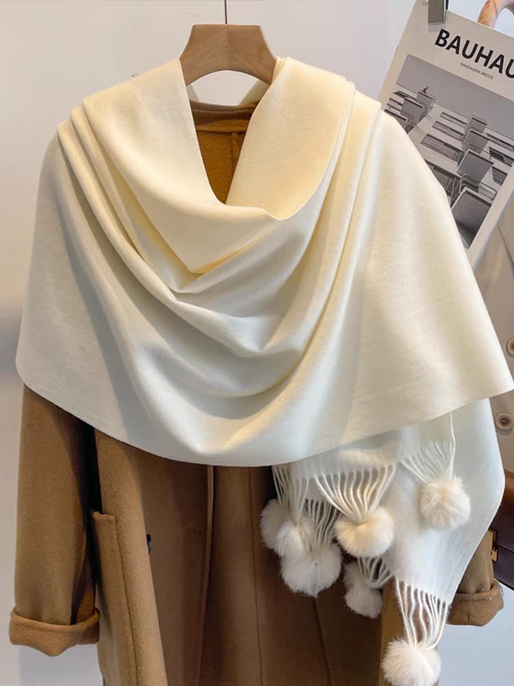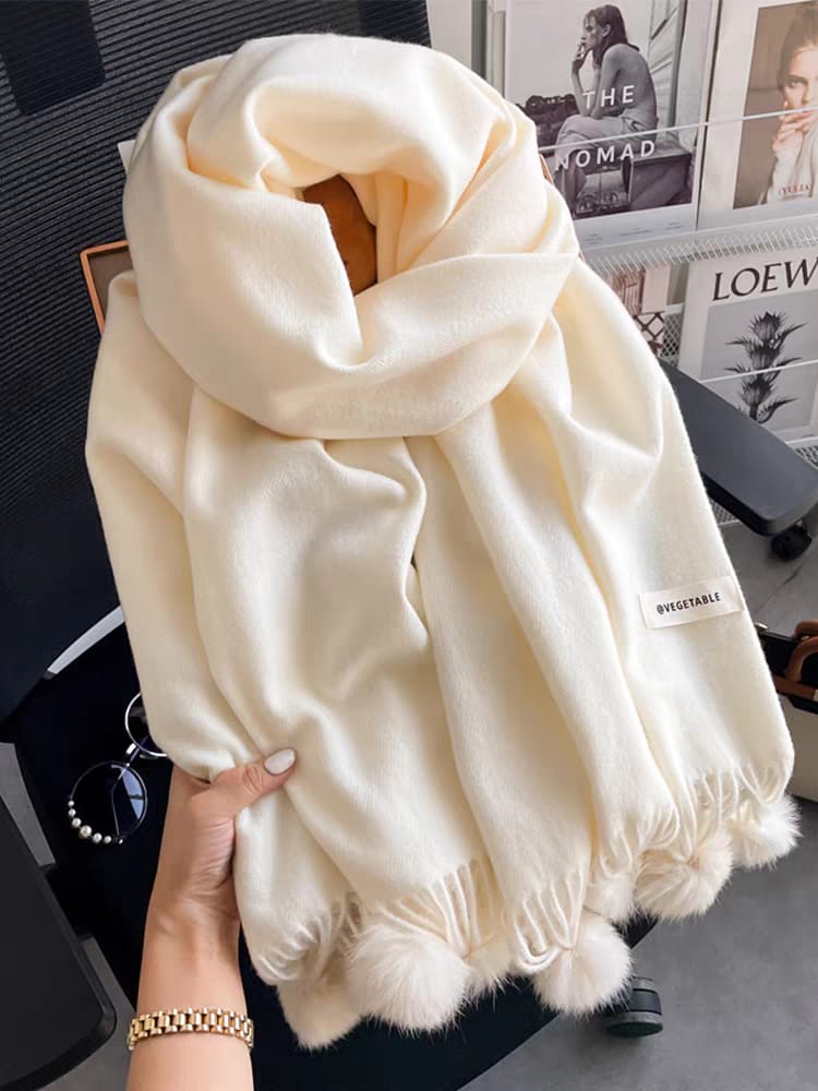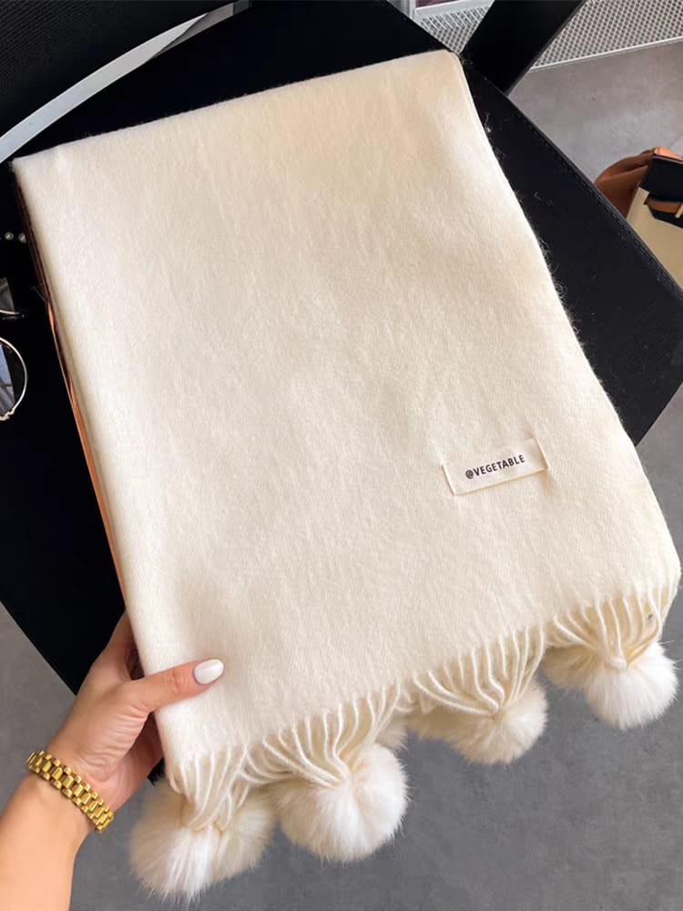 Bufanda grande con pompones de color liso, en color hueso y marrón claro.