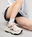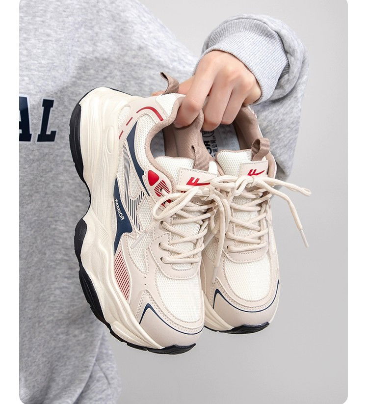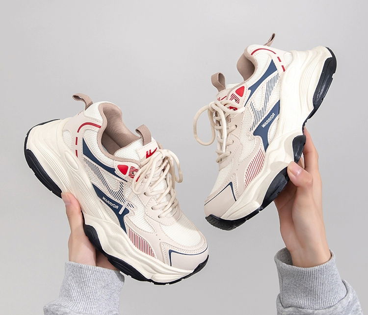 Zapatillas urbanas chunky Diseño moderno en tonos neutros con detalles en azul y rojo. .