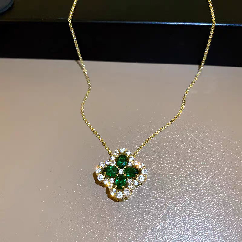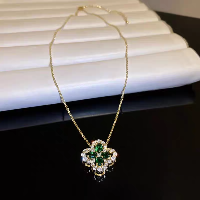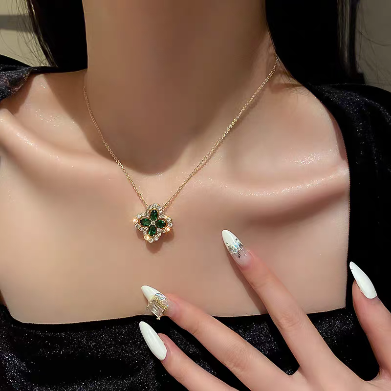 Collar dorado con delicado dije en forma de trébol, decorado con cristales verdes tipo esmeralda y brillantes transparentes que realzan su luminosidad. Un diseño sofisticado y atemporal, ideal para ocasiones especiales o para elevar cualquier look diario con un toque de lujo y distinción