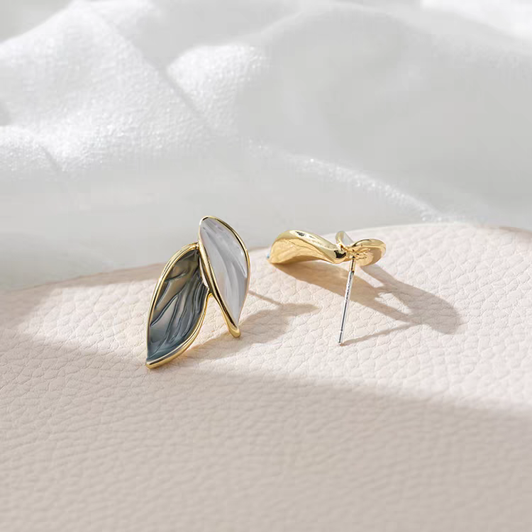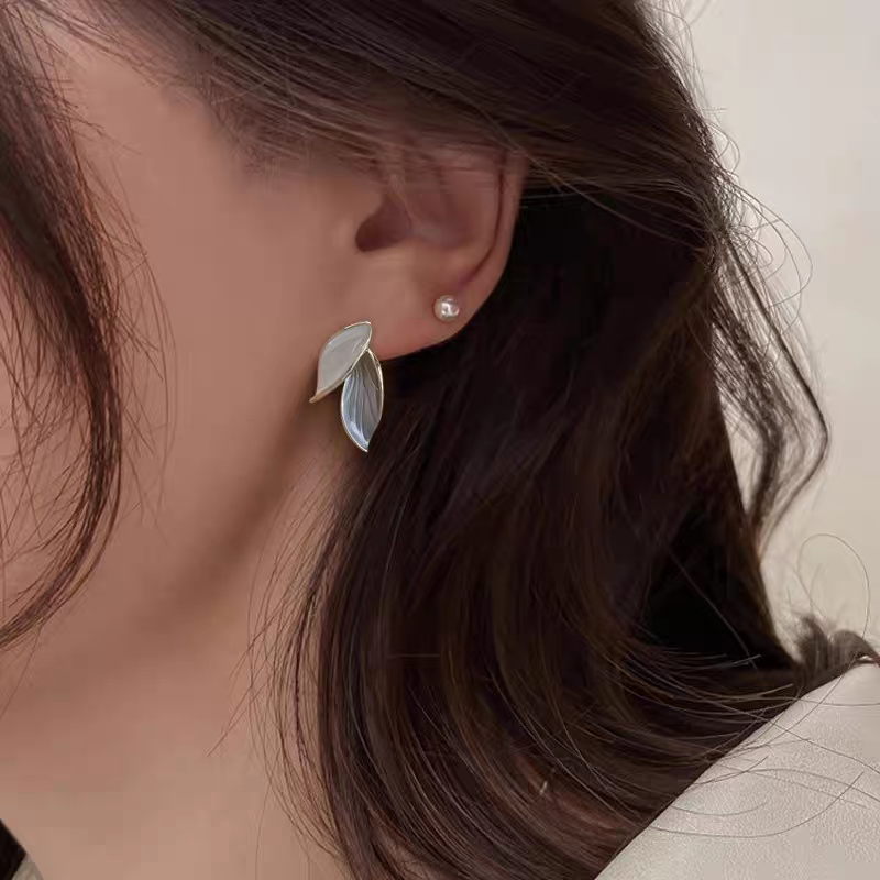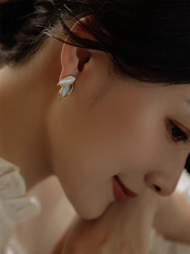 Estos pendientes presentan un diseño de hojas superpuestas con un exquisito acabado perlado que refleja la luz de manera suave y elegante.
