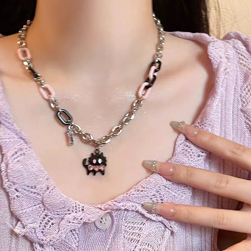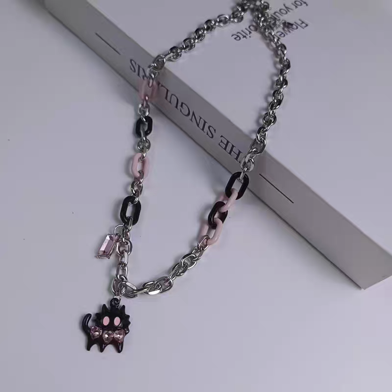 ¿Quién dijo que lo tierno no puede ser audaz? Este collar combina una cadena de eslabones industriales con toques de resina en rosa pastel y negro azabache.