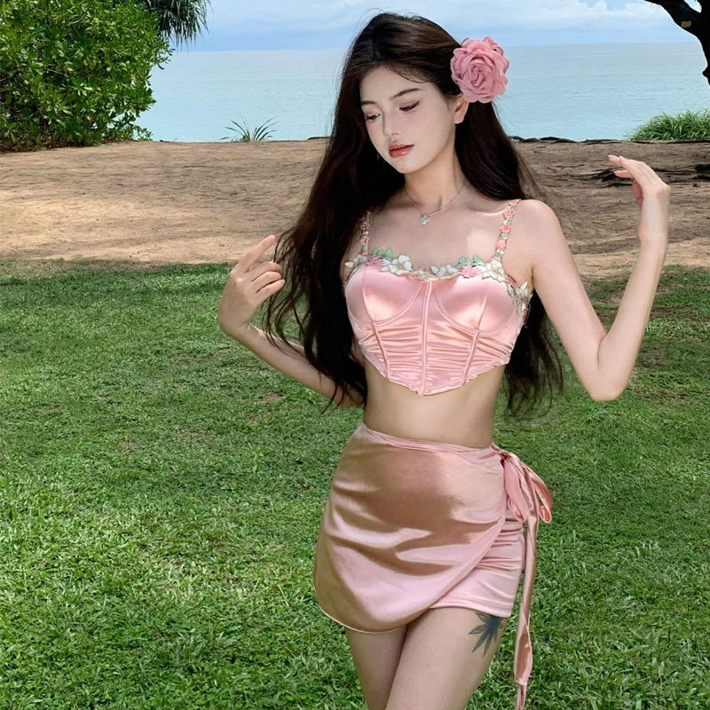 Bikini de tres piezas en tono rosa satinado, con corpiño estilo corset que realza el busto y estiliza la silueta, incluye bombacha y pareo a juego.
