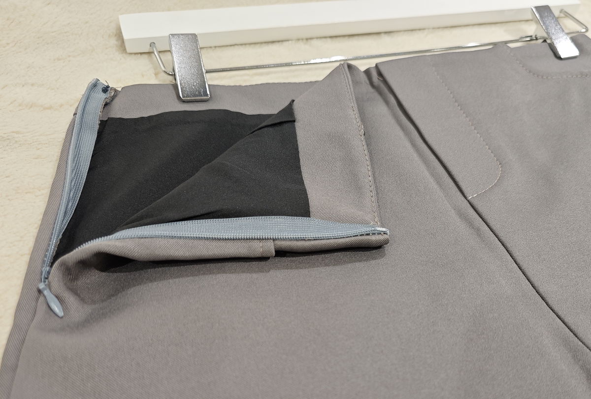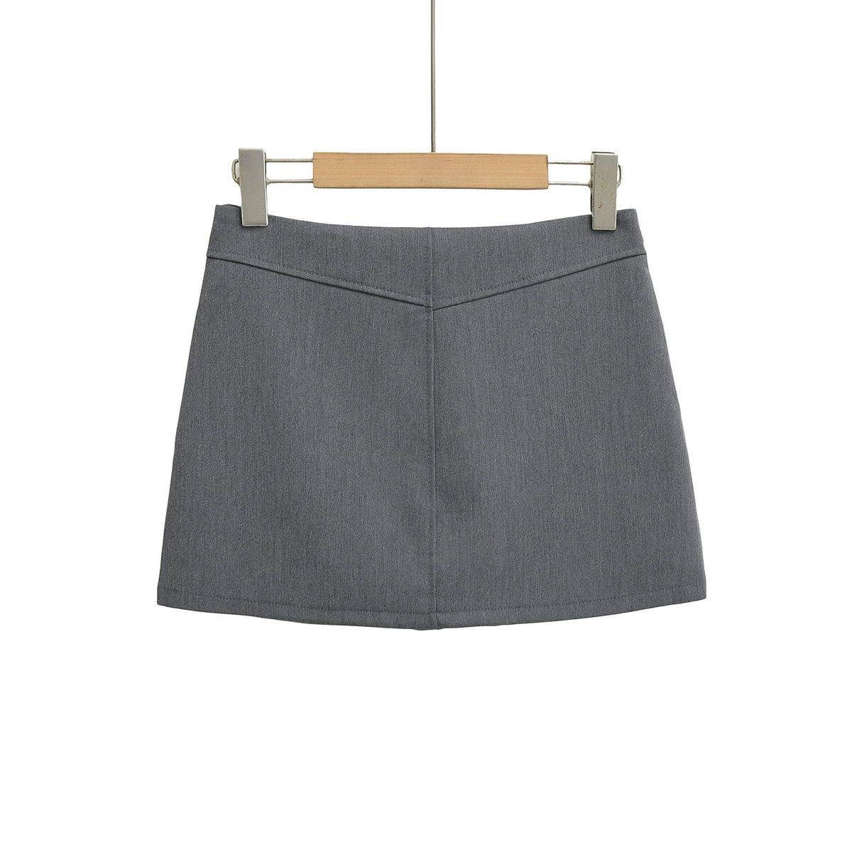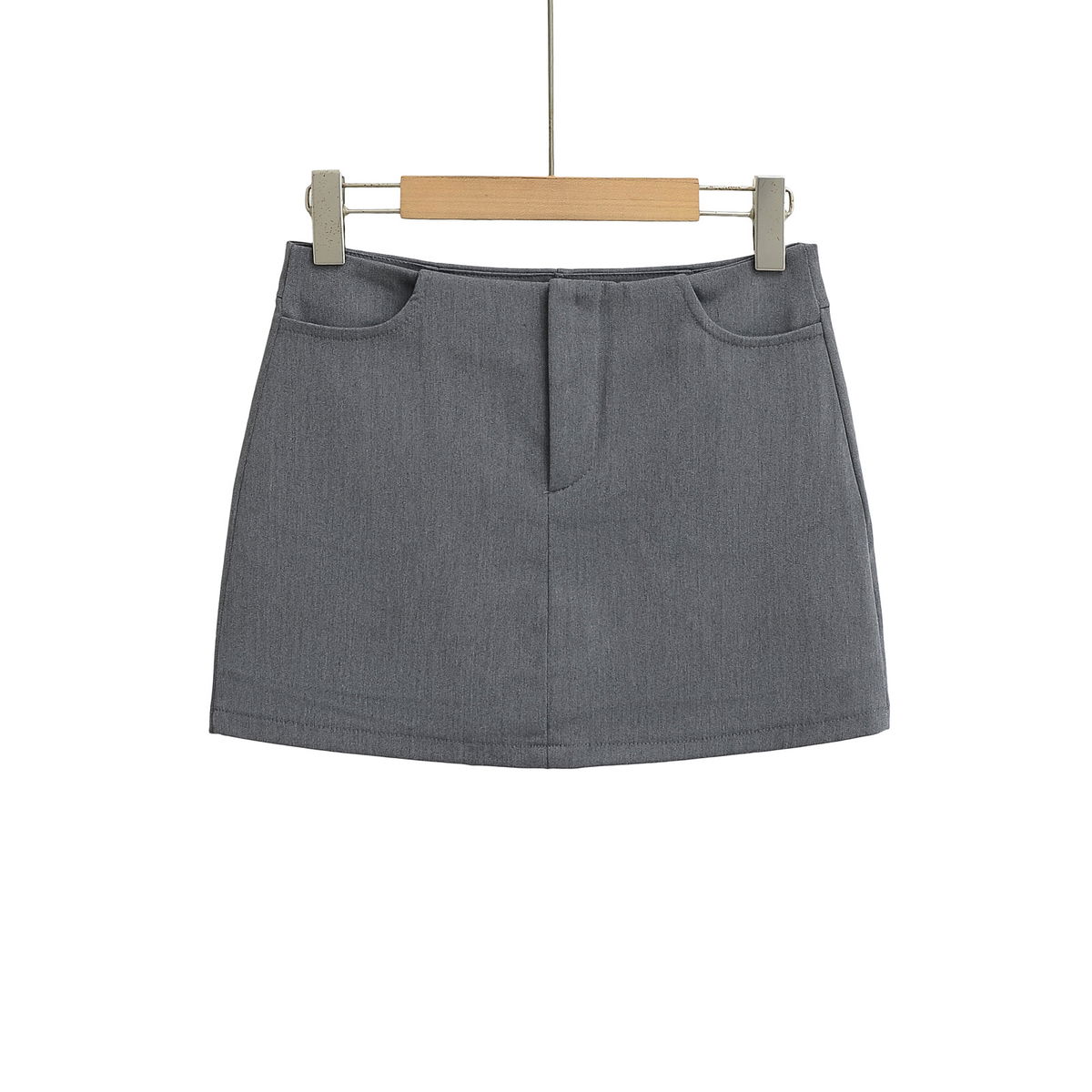 Pollera mini de corte recto en tono gris, con diseño minimalista y bolsillos frontales funcionales.