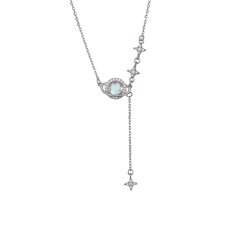 Lleva el cosmos contigo. ✨ Este collar estilo "corbata" combina la elegancia de una cadena fina con la magia de un planeta de cristal dicroico que cambia de color según la luz. Los detalles de estrellas colgantes estilizan el cuello y añaden un toque soñador a cualquier look.