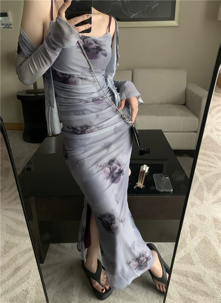Talle L: Vestido Busto 100, Cintura 92, Largo 101. Cárdigan Hombro 48, Busto 92, Mangas 64, Largo 50.