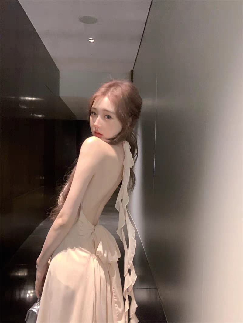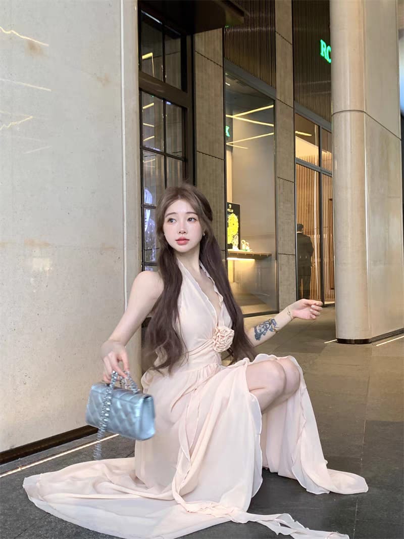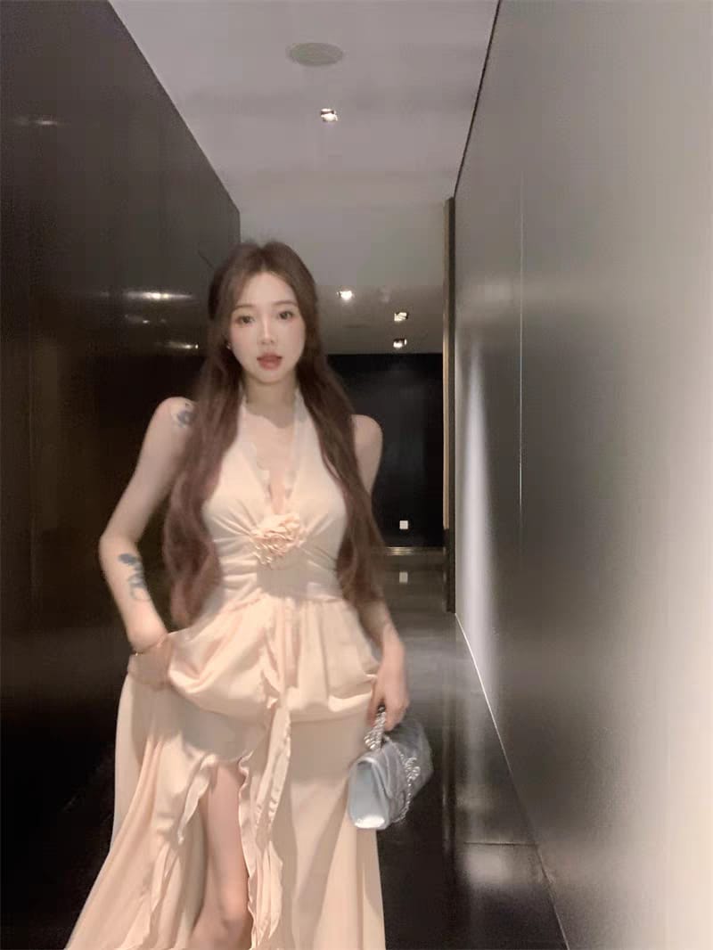 Vestido Maxi de Gasa Rosa Nude: con Flor 3D, Espalda Descubierta y Volados.